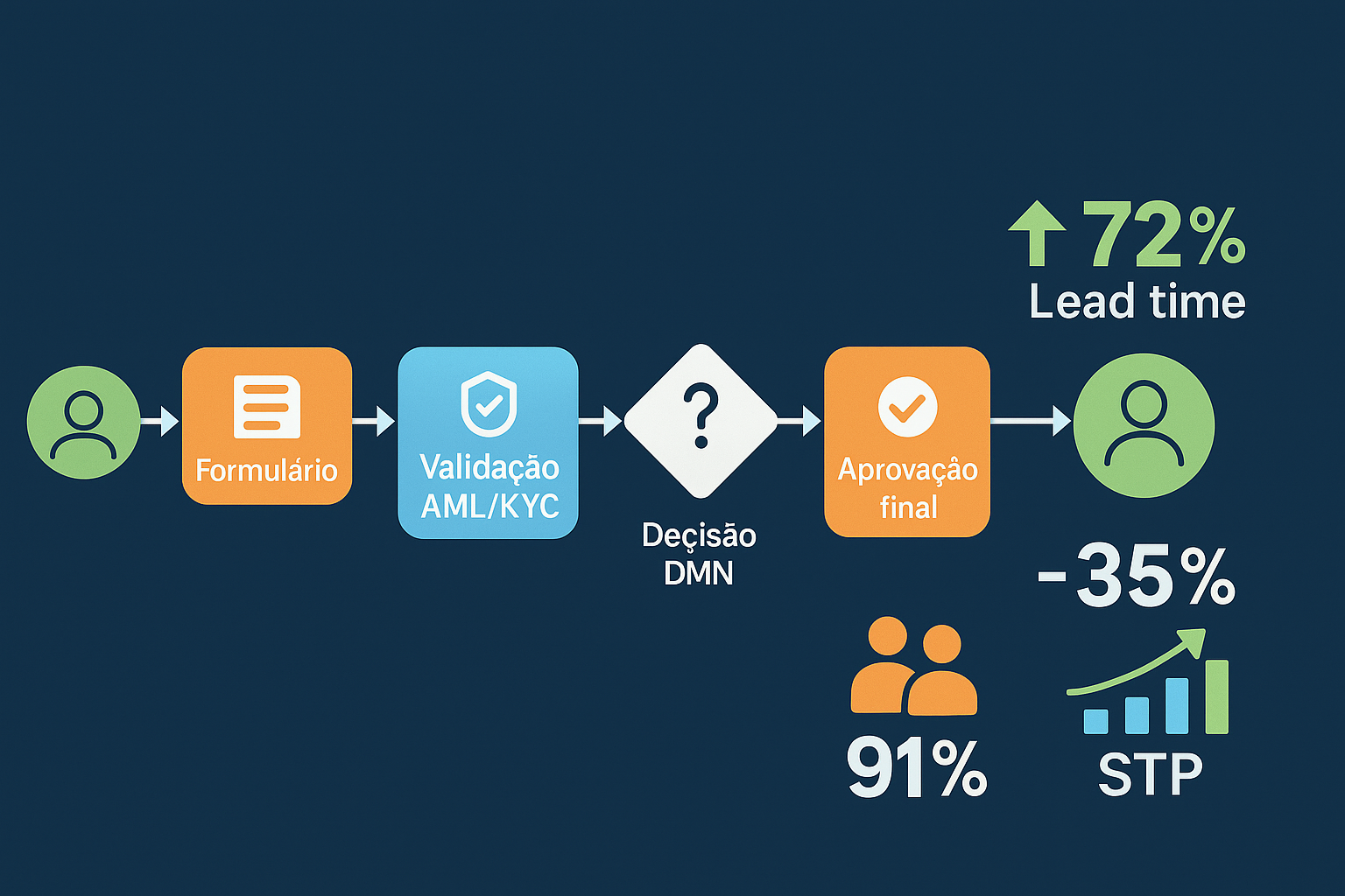 Um caso real de orquestração de onboarding que reduziu o lead time em 72%, aumentou o STP para 91% e diminuiu reclamações em 35%.